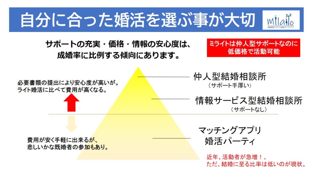 マッチングアプリや婚活パーティーと比べて低い状況となります。